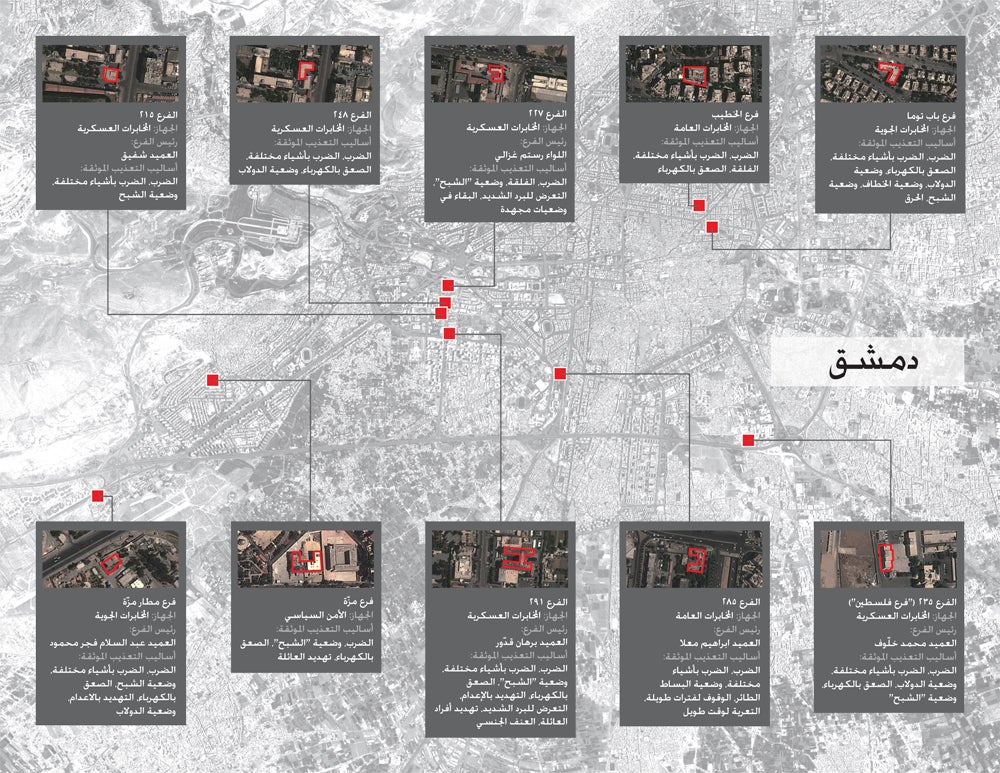 Locations of detention centers that were identified by multiple witnesses. Using satellite imagery, Human Rights Watch asked the victims and defectors to point out the buildings where torture took place. Former detainees and defectors corroborated the findings.