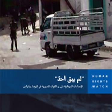 (لندن) – قالت هيومن رايتس ووتش في تقرير أصدرته اليوم إن جنوداً سوريين منشقين قاموا بذكر أسماء 74 قائداً ومسؤولاً يتحملون مسؤولية هجمات على متظاهرين عُزّل. يذكر التقرير أسماء القادة والمسؤولين بالجيش السوري وأجهزة المخابرات السورية الذين يُزعم أنهم أمروا أو صرحوا أو تغاضوا عن عمليات القتل الموسعة والتعذيب والاعتقالات غير القانونية خلال مظاهرات عام 2011 ضد السلطات. ودعت هيومن رايتس ووتش مجلس الأمن إلى إحالة الوضع في سوريا إلى المحكمة الجنائية الدولية، وأن يفرض عقوبات على المسؤولين المتورطين في الانتهاكات.
