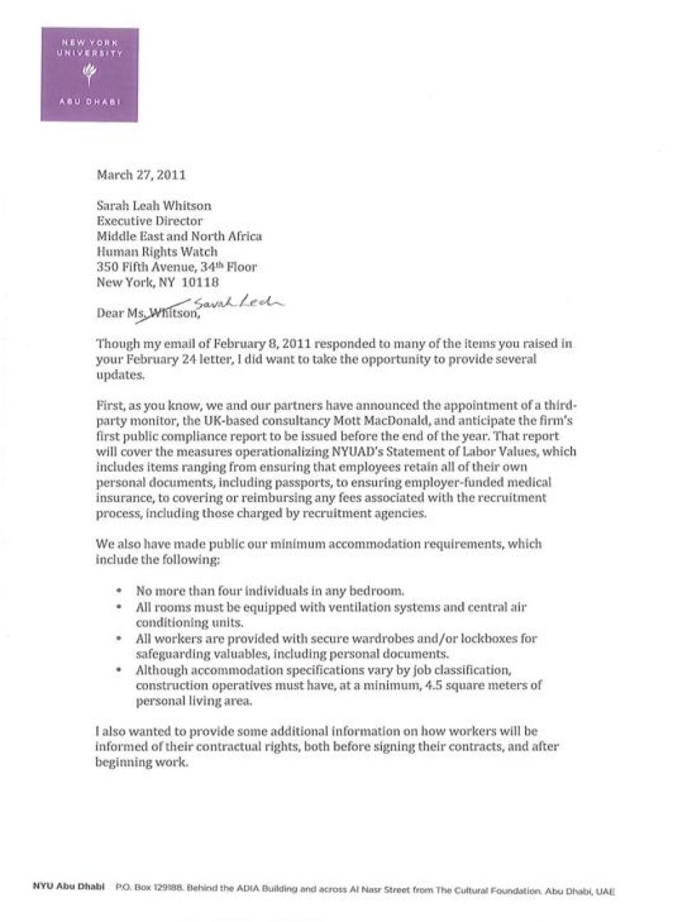 ورغم استمرار جامعة نيويورك في الصمت بشأن هذه الوعود الأولى، فقد أقرت الجامعة بالحاجة لضمان تلقي العمال للمعلومات الكاملة عن عملهم قبل توقيع العقود. رد الجامعة على هيومن رايتس ووتش ورد فيه أن: "لابد أن تتوفر العقود دائماً بالإنجليزية والعربية (كما ورد في نص القانون الإماراتي)، وأن بالإضافة إلى ذلك، لابد من توفر مترجمين للمعاونة قبل توقيع العقد. نحن نتواصل مع المقاولين لضمان حدوث هذا من الآن فصاعدا". [25]