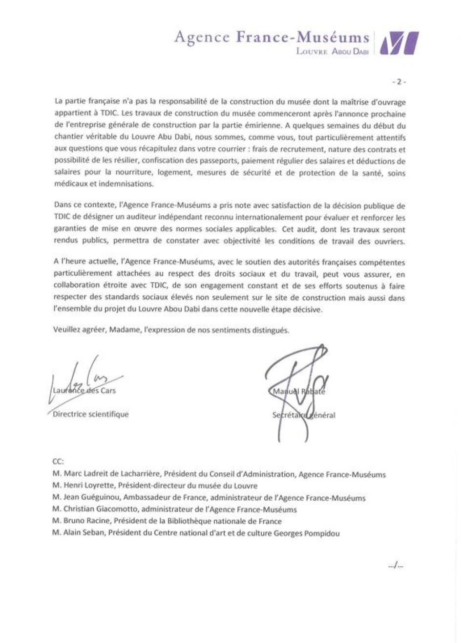 الرد المشترك الذي تلقيناه كتابةً من وكالة المتاحف الفرنسية ومتحف اللوفر على رسالتنا في فبراير/شباط 2011 وصف الأهمية التي يولونها لحقوق العمال، وأشاروا إلى: "داومنا على تشجيع وتطبيق ممارسات المسؤولية الاجتماعية في إطار العمل بموقع بناء اللوفر-أبو ظبي" وشددوا على التزامهم القوي بـ "المعايير الاجتماعية العالية، ليس فقط في موقع البناء، بل أيضاً في كل أجزاء مشروع اللوفر-أبو ظبي". إلا أن الرسالة لم تتناول بواعث القلق الخاصة بالانتهاكات على الجزيرة. ورغم التعبير عن التزامات قوية بضمان احترام حقوق العمال، فإن وكالة المتاحف الفرنسية استمرت في الخصم من مسؤوليات المتحف إزاء العمال: "الطرف الفرنسي ليست عليه أية مسؤولية في بناء المتحف، بما أن الطرف المُكلف بهذا الأمر بموجب الاتفاق هو شركة التطوير والاستثمار السياحي".[9]