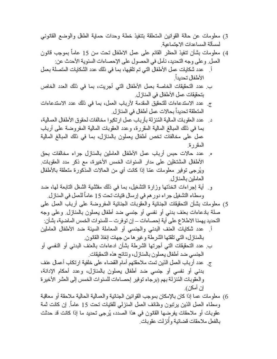 مطلوب تشريعات وطنية لتنظيم العمل المنزلي؛ من أجل ضمان أن جميع عاملات المنازل من كافة الأعمار – بما في ذلك الفتيات فوق سن التوظيف القانونية – يتمتعن بالحقوق العمالية الأساسية وبظروف العمل الملائمة. لابد من تعديل قانون العمل المنزلي المقترح بحيث يصبح متسقاً مع اتفاقية منظمة العمل الدولية لعام 2011 الخاصة بظروف العمل الملائمة لعاملات المنازل (اتفاقية رقم 189) وإقراره بسرعة.
