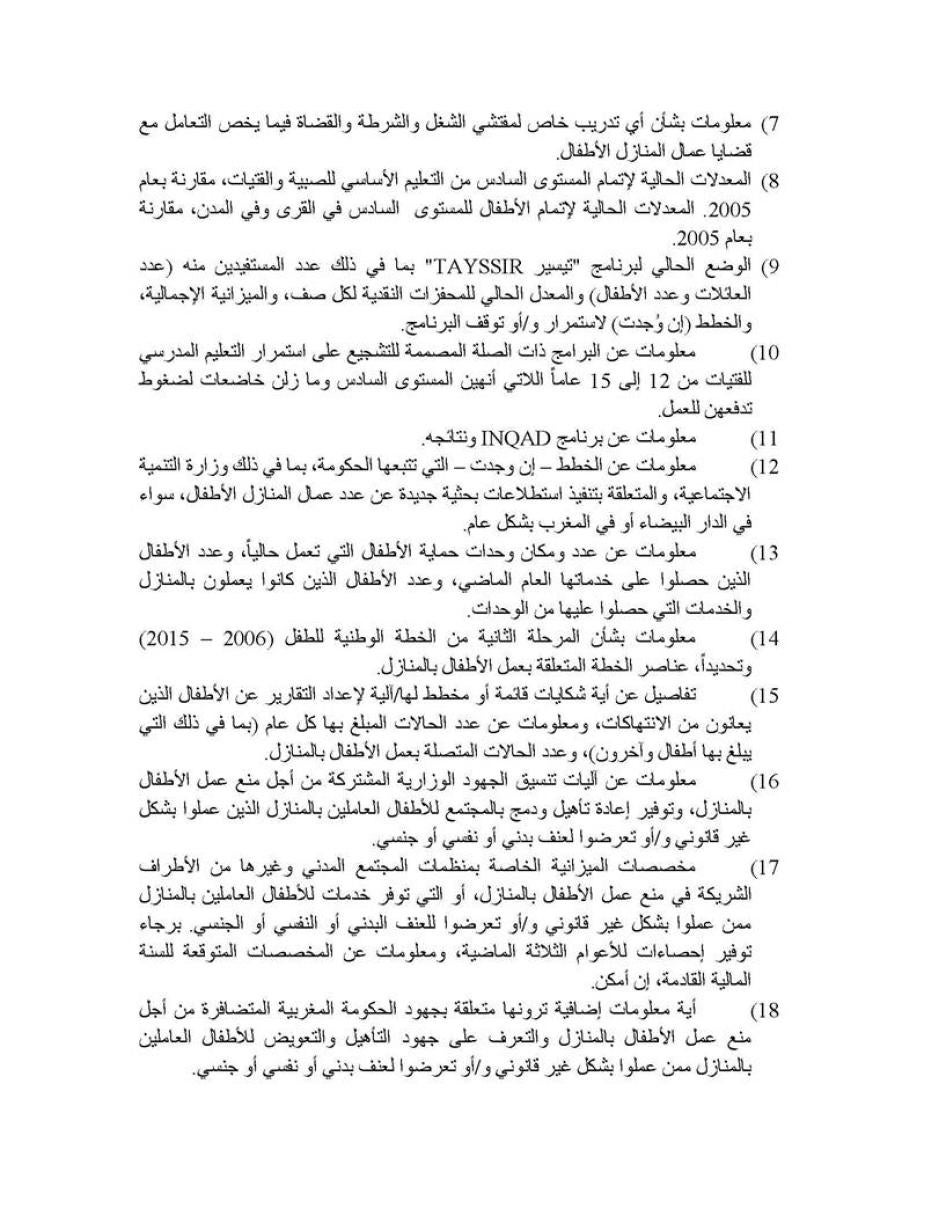 تدعو هيومن رايتس ووتش الحكومة المغربية إلى تبني إجراءات إضافية من أجل القضاء الفعال على عمل الأطفال بالمنازل، أخذاً في الاعتبار عزلة العاملات وعرضتهن الأكبر للضرر وهن يعملن في البيوت كعاملات المنازل. لابد أن تشتمل هذه الإجراءات على آليات محددة للتعرف على الفتيات المعرضات للعمل المنزلي غير القانوني والمسيئ والاستغلالي، مع التحقيق في هذه الحالات، وتوفير الدعم الملائم، بما في ذلك المأوى ولم الشمل بالأسرة والإعادة إلى المدرسة وفرض عقوبات إن لزم الأمر أو ملاحقات جنائية ضد أصحاب العمل.