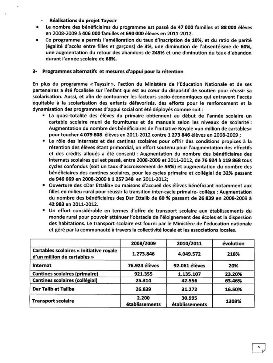 ولقد أدت الجهود الحكومية لزيادة التحاق الأطفال بالمدارس وتوفير الدعم المالي للأسر الفقيرة التي قد تدفع أطفالها للعمل، أدت إلى تقليل عمل الأطفال. يعد برنامج المخصصات النقدية مثلا من المبادرات المهمة، فهو يقدم 60 إلى 140 درهماً (7 – 16 دولاراً) للأسر كمخصص شهري عن كل طفل تشجيعا على ارتياد الأطفال للمدارس. طبقاً لوزارة التعليم، استفاد من البرنامج 690 ألف تلميذ في مناطق ريفية فقيرة خلال 2011 و2012، وانتهى تقييم مستقل إلى أن ذلك أدى لخفض معدلات التسرب من المدارس بين متلقيّ الدعم بنسبة 68% على مدار ثلاثة أعوام. كما وفرت الحكومة حقائب كتب وغيرها من المستلزمات لأكثر من 4 ملايين تلميذ في عمر المدارس الابتدائية، وتوسعت في تقديم الوجبات للتلاميذ بواقع 32 في المائة من 2008 إلى 2012.