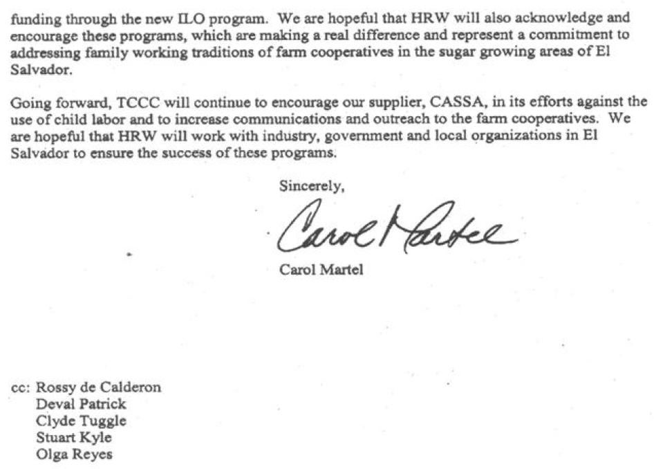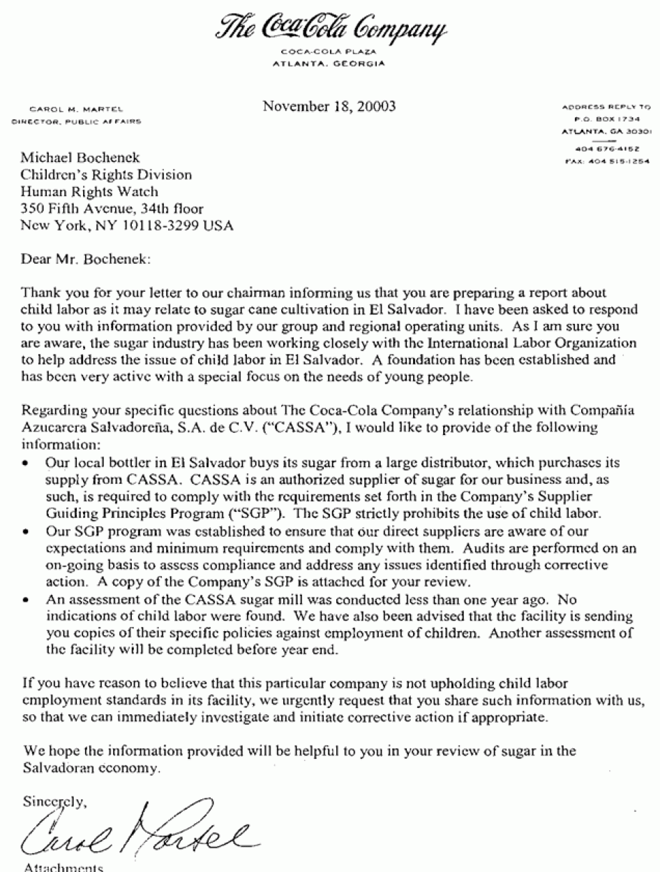 [271] Carta de Carol M. Martel, directora de asuntos públicos, The Coca-Cola Company, a Michael Bochenek, consejero, División de Derechos del Niño, Human Rights Watch, 18 de noviembre de 2003.