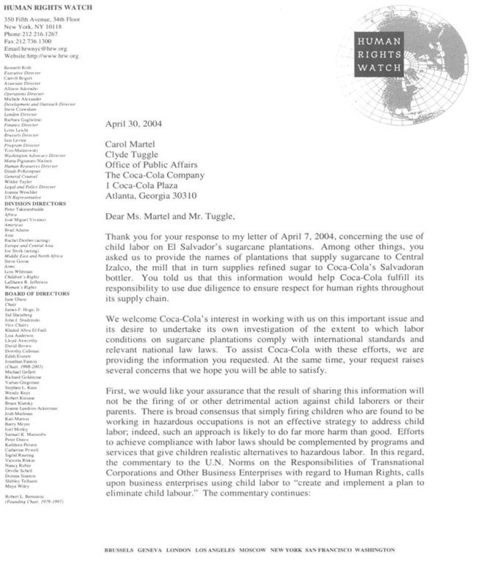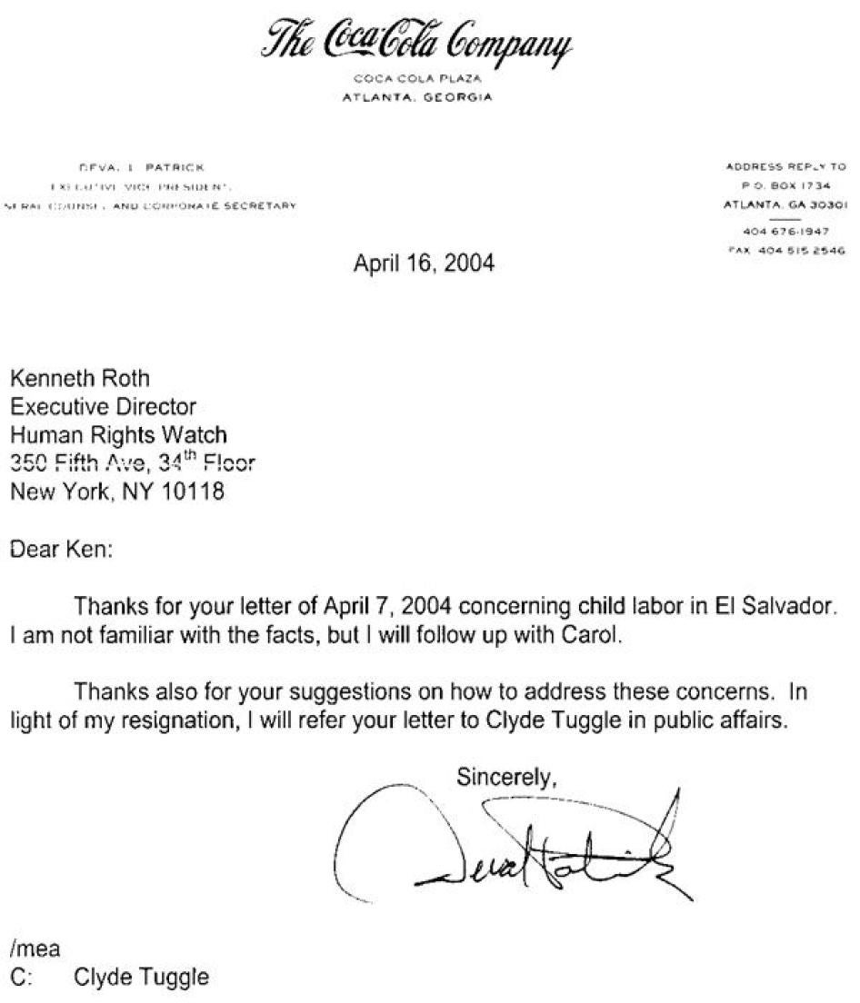 [270] Carta de Michael Bochenek, consejero, División de Derechos del Niño, Human Rights Watch, a Douglas N. Daft, presidentee director ejecutivo, The Coca-Cola Company, 14 de octubre de 2003 (artículo certificado número 7000 0600 0027 2482 8734, sellado en Richmond, Vermont, 15 de octubre de 2003; recibo firmado por Leon Massey y sellado en Atlanta, Georgia, 17 de octubre de 2003).  Véase también carta de Kenneth Roth, director ejecutivo, Human Rights Watch, a Deval L. Patrick, vicepresidente ejecutivo, consejero general y secretario corporativo, The Coca-Cola Company, 7 de abril de 2004 (DHL Waybill No. 9148979954; recibida el 8 de abril de 2004, por J. Howard); carta de Kenneth Roth, director ejecutivo, Human Rights Watch, a Carol Martel y Clyde Tuggle, Oficina de Asuntos Públicos, The Coca-Cola Company, 30 de abril de 2004 (DHL Waybill No. 9148982043; recibido el 3 de mayo de 2004, por J. Howard).