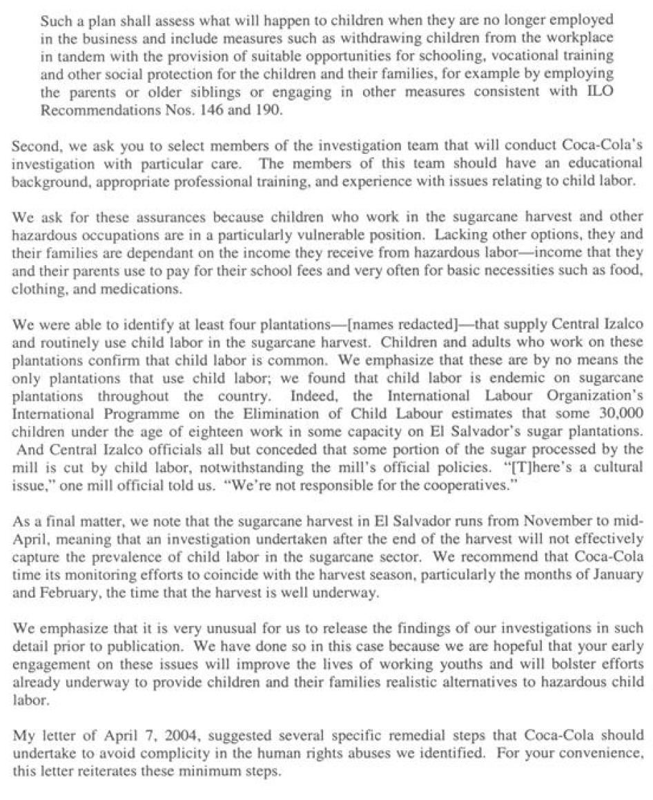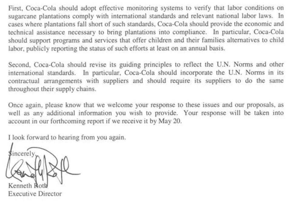 • Coca-Cola y otras empresas que compran azúcar refinado para sus productos deben adoptar sistemas de control efectivos para verificar que las condiciones laborales en las plantaciones de caña de azúcar cumplen las normas internacionales y las leyes laborales nacionales relevantes. En los casos en que las plantaciones incumplan dichas normas, Coca-Cola y las demás empresas deben ofrecer la necesaria asistencia económica y técnica para que las plantaciones cumplan sus obligaciones.  En particular, Coca-Cola y otras empresas deben apoyar programas y servicios que ofrezcan a los niños y a sus familias alternativas al trabajo infantil, informando públicamente de la situación de dichas iniciativas al menos una vez al año.