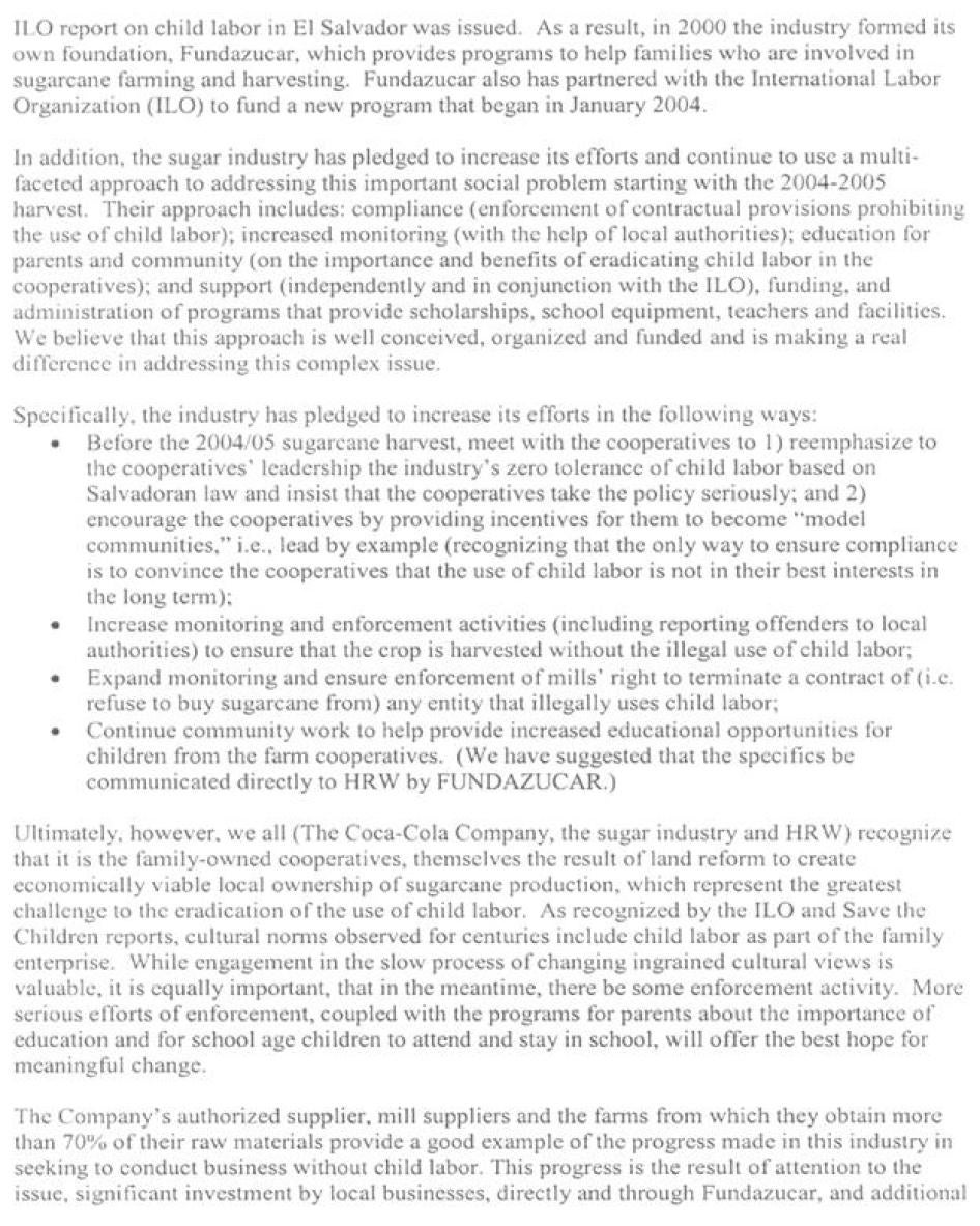Una de estas empresas es The Coca-Cola Company, que utiliza azúcar del ingenio más grande de El Salvador, Central Izalco, situado en el departamento de Sonsonate.[6]  Coca-Cola utiliza azúcar salvadoreño en sus bebidas embotelladas para el consumo nacional en El Salvador y en sus bebidas enlatadas comercializadas en todo Centroamérica. Después de entrevistar a niños y adultos que trabajan en las plantaciones, Human Rights Watch concluyó que al menos cuatro de las plantaciones que suministran caña de azúcar a la Central Izalco utilizan habitualmente trabajo infantil. Cuando Human Rights Watch planteó esta información a Coca-Cola, Coca-Cola pidió al ingenio que le suministraba azúcar que realizara su propia investigación sobre el uso de mano de obra infantil en las plantaciones que le suministran caña de azúcar.[7] La amplia respuesta de Coca-Cola a la información suministrada por Human Rights Watch no contradijo nuestras conclusiones. En cambio, Coca-Cola respondió únicamente en términos de sus proveedores directos: “Nuestra revisión ha revelado que ninguna de las cuatro compañías identificadas en la carta suministraron directamente producto alguno a The Coca-Cola Company (TCCC), y ni la TCCC ni el embotellador salvadoreño tienen ningún contrato comercial con estas cooperativas agrícolas”, escribió la directora de asuntos públicos de Coca-Cola a Human Rights Watch.[8]