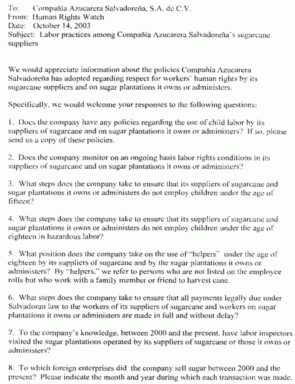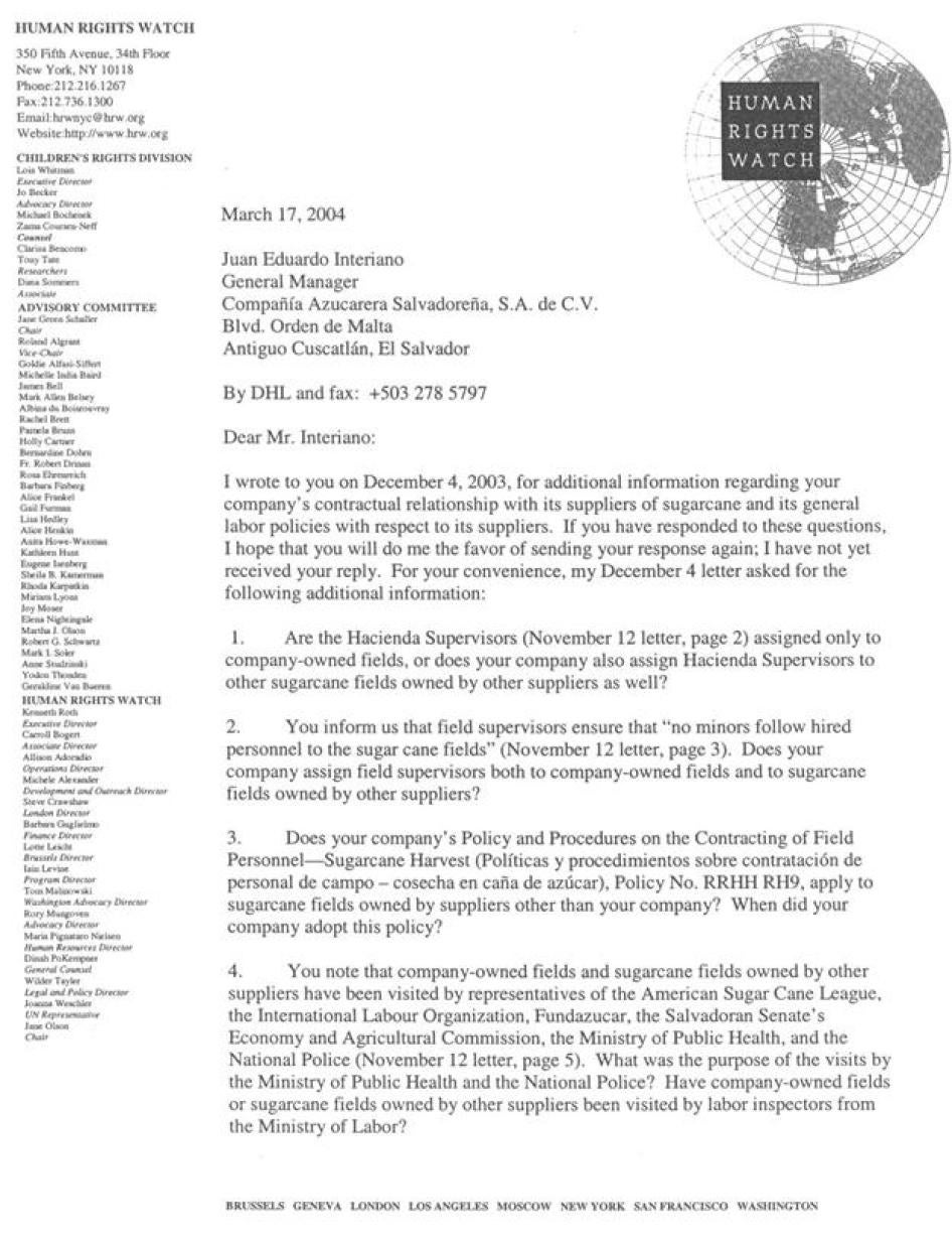 APÉNDICE B:  CORRESPONDENCIA ENTRE HUMAN RIGHTS WATCH Y LA COMPAÑÍA AZUCARERA SALVADOREÑA, S.A. de C.V.