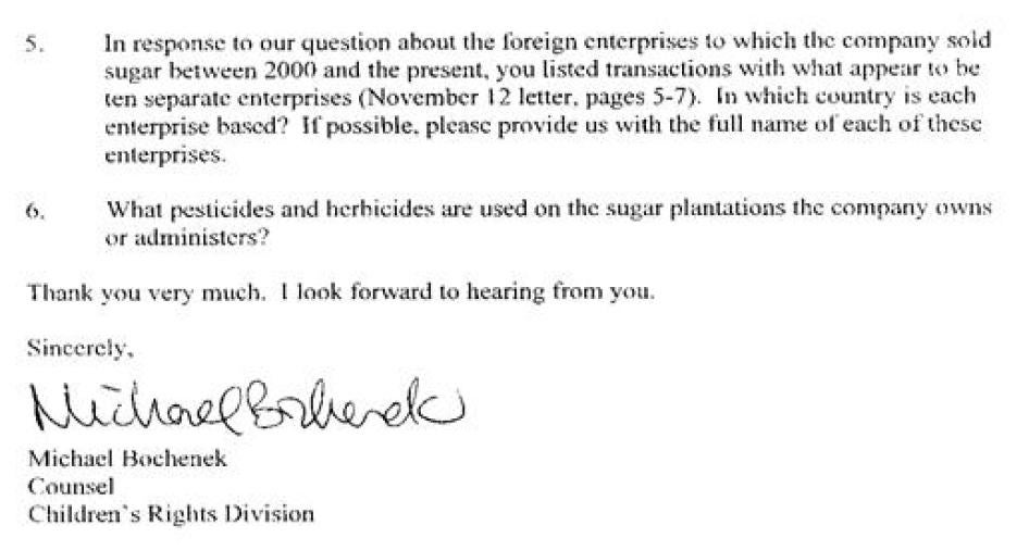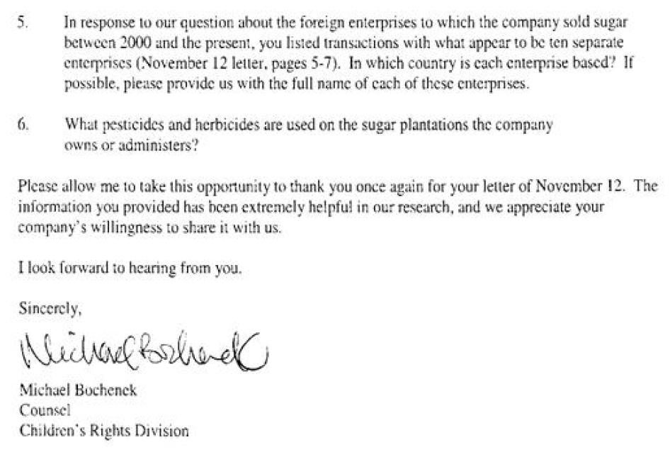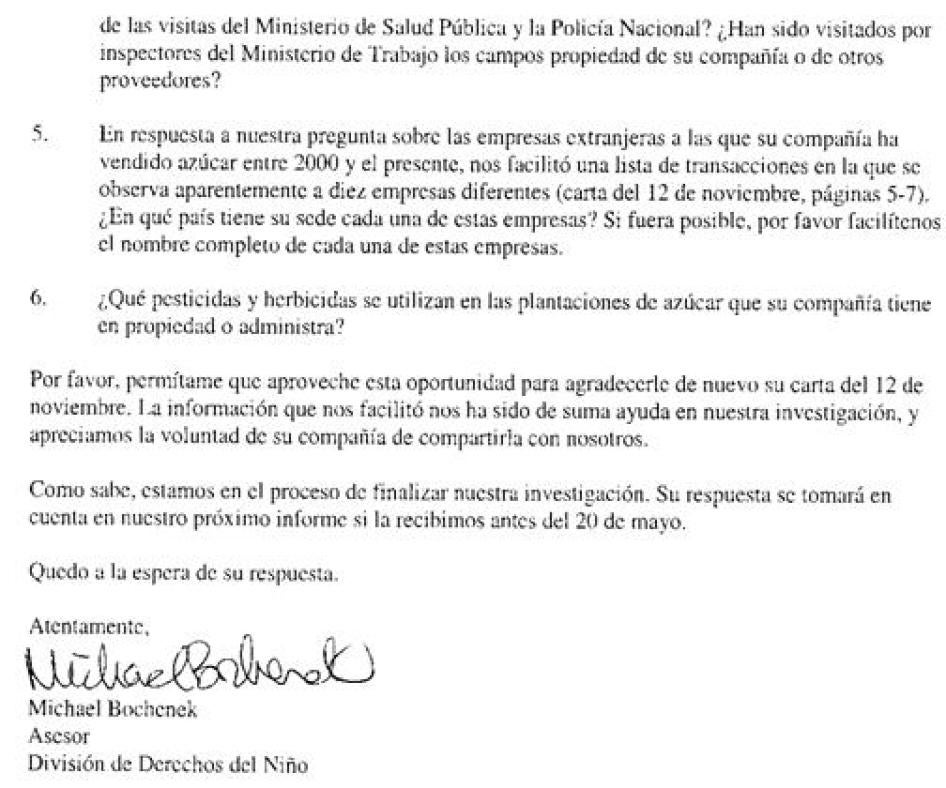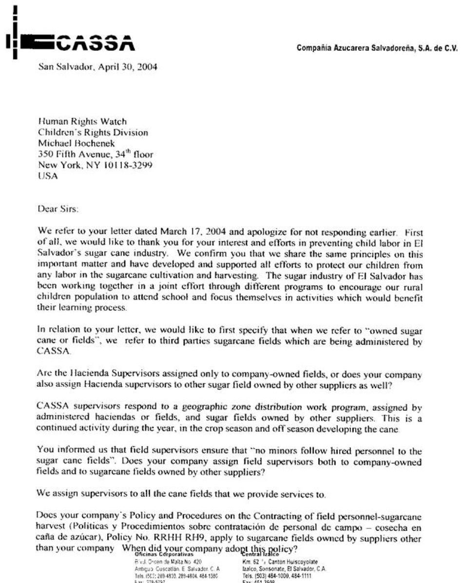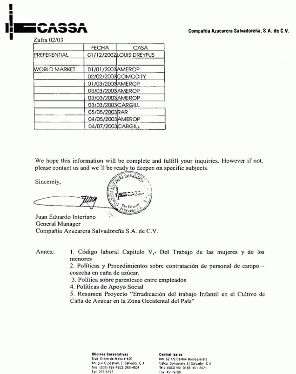 [229] Véase carta de Juan Eduardo Interiano, gerente general, Compañía Azucarera Salvadoreña, S.A. de C.V., a Michael Bochenek, consejero, División de Derechos del Niño, Human Rights Watch, 12 de noviembre de 2003, pp. 5-7.  Human Rights Watch escribió a cada una de estas compañías multinacionales pidiéndoles confirmación de esta información.   Véase carta de Michael Bochenek, consejero, División de Derechos del Niño, Human Rights Watch, a Amerop Sugar Corp., 22 de marzo de 2004 (DHL Waybill No. 9148976734; recibida el 24 de marzo de 2004, 10:22 a.m., por A. Oliva); carta de Michael Bochenek, consejero, División de Derechos del Niño, Human Rights Watch, a Warren R. Staley, presidente y director ejecutivo, Cargill, Inc., 22 de marzo de 2004 (DHL Waybill No. 9148976756; recibida el 24 de marzo de 2004, 8:38 a.m., por V. Koosman); carta de Michael Bochenek, consejero, División de Derechos del Niño, Human Rights Watch, a Willy R. Strothotte, presidente, Glencore International AG, 22 de marzo de 2004 (DHL Waybill No. 7845587271; recibida el 24 de marzo de 2004, 9:38 a.m. por Beeler); carta de Michael Bochenek, consejero, División de Derechos del Niño, Human Rights Watch, a Peter B. Griffin, presidente, Louis Dreyfus Corp., 22 de marzo de 2004 (DHL Waybill No. 9148976745; recibida el 23 de marzo de 2004, 10:07 a.m., por J. Edo); carta de Michael Bochenek, consejero, División de Derechos del Niño, Human Rights Watch, a Tohru Tsuji, presidente, Marubeni Corp., 22 de marzo de 2004 (DHL Waybill No. 7845587260; recibida el 24 de marzo de 2004, 4:58 p.m. por Kataoka).