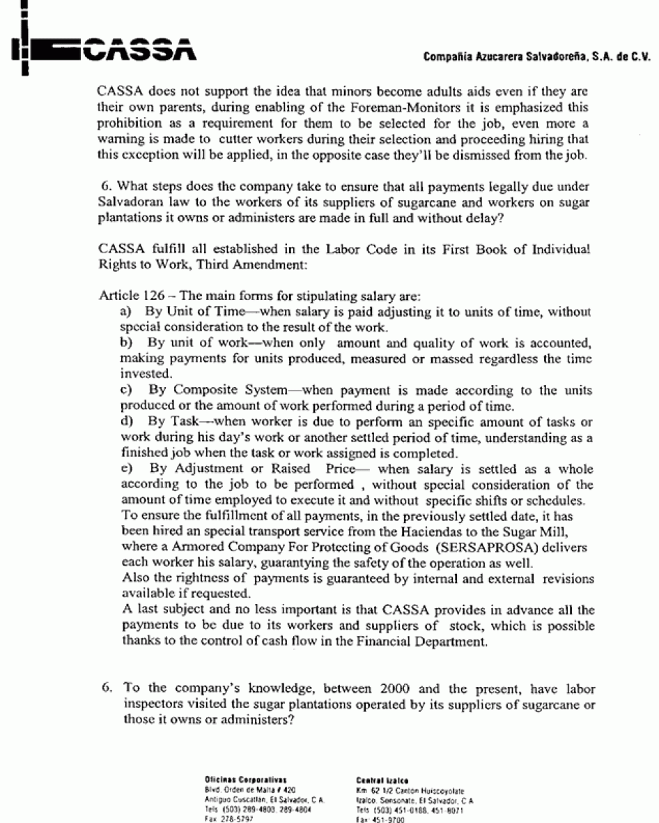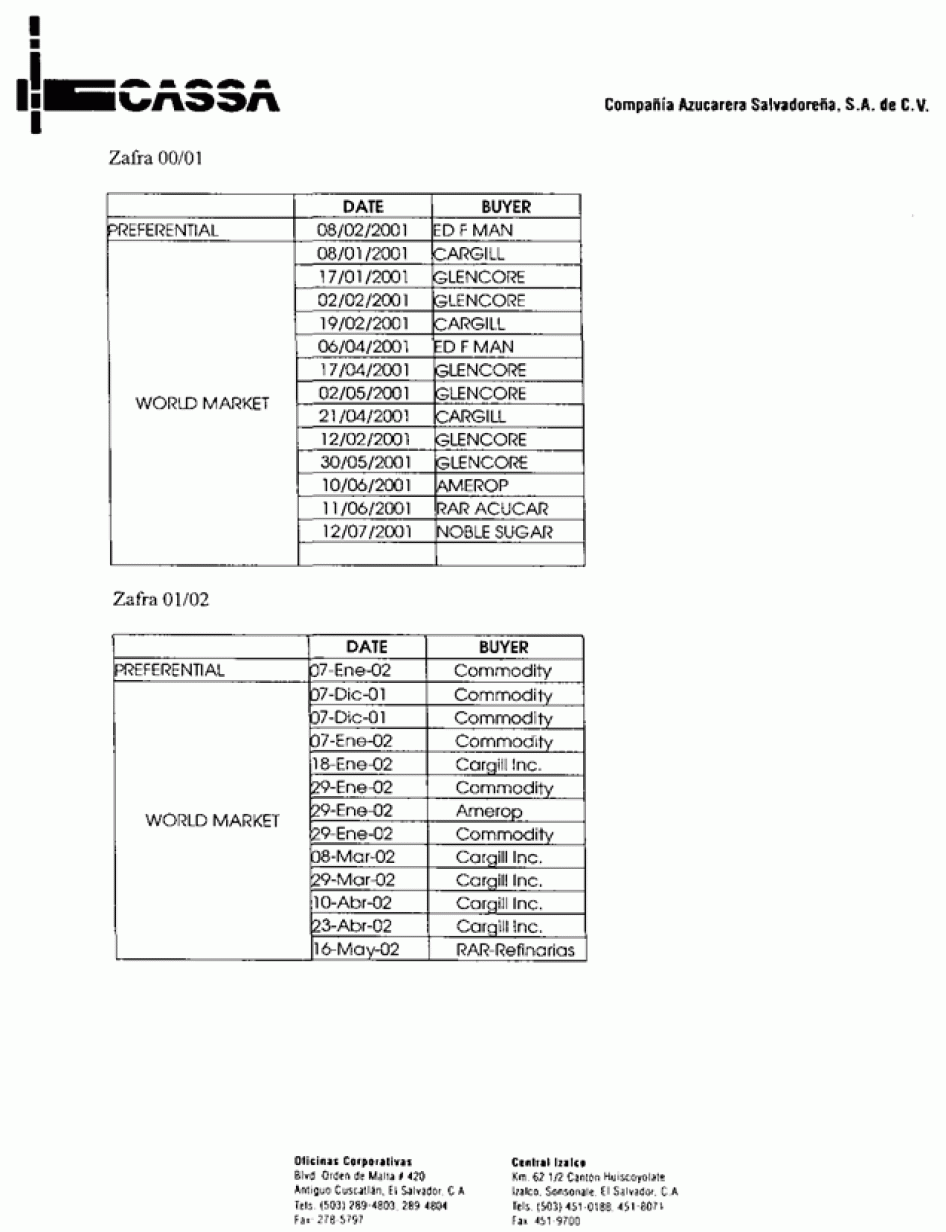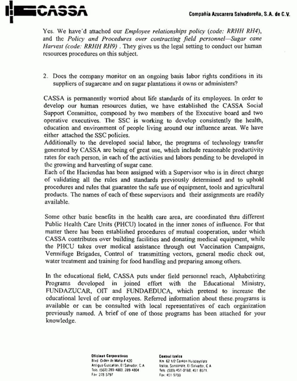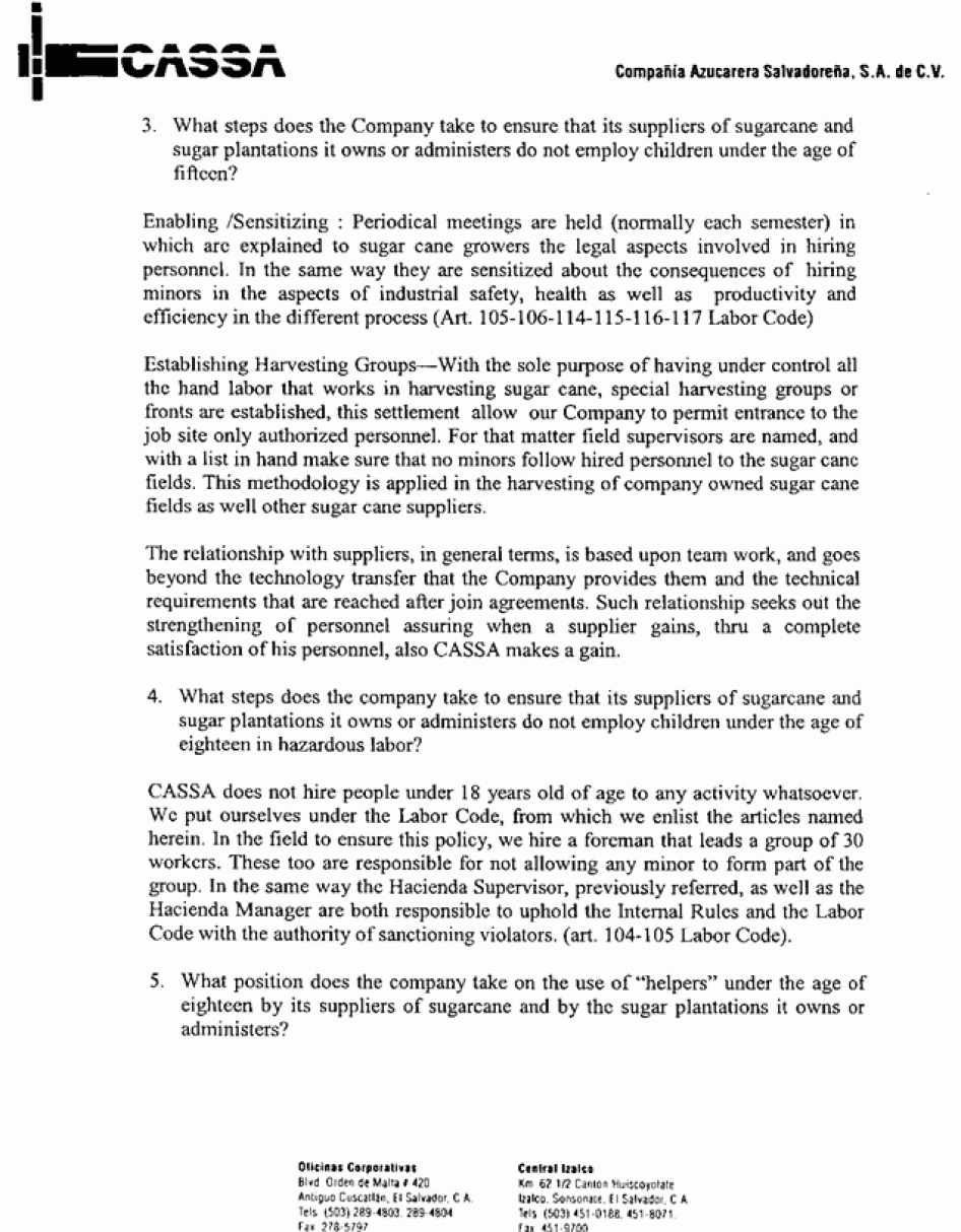[229] Véase carta de Juan Eduardo Interiano, gerente general, Compañía Azucarera Salvadoreña, S.A. de C.V., a Michael Bochenek, consejero, División de Derechos del Niño, Human Rights Watch, 12 de noviembre de 2003, pp. 5-7.  Human Rights Watch escribió a cada una de estas compañías multinacionales pidiéndoles confirmación de esta información.   Véase carta de Michael Bochenek, consejero, División de Derechos del Niño, Human Rights Watch, a Amerop Sugar Corp., 22 de marzo de 2004 (DHL Waybill No. 9148976734; recibida el 24 de marzo de 2004, 10:22 a.m., por A. Oliva); carta de Michael Bochenek, consejero, División de Derechos del Niño, Human Rights Watch, a Warren R. Staley, presidente y director ejecutivo, Cargill, Inc., 22 de marzo de 2004 (DHL Waybill No. 9148976756; recibida el 24 de marzo de 2004, 8:38 a.m., por V. Koosman); carta de Michael Bochenek, consejero, División de Derechos del Niño, Human Rights Watch, a Willy R. Strothotte, presidente, Glencore International AG, 22 de marzo de 2004 (DHL Waybill No. 7845587271; recibida el 24 de marzo de 2004, 9:38 a.m. por Beeler); carta de Michael Bochenek, consejero, División de Derechos del Niño, Human Rights Watch, a Peter B. Griffin, presidente, Louis Dreyfus Corp., 22 de marzo de 2004 (DHL Waybill No. 9148976745; recibida el 23 de marzo de 2004, 10:07 a.m., por J. Edo); carta de Michael Bochenek, consejero, División de Derechos del Niño, Human Rights Watch, a Tohru Tsuji, presidente, Marubeni Corp., 22 de marzo de 2004 (DHL Waybill No. 7845587260; recibida el 24 de marzo de 2004, 4:58 p.m. por Kataoka).