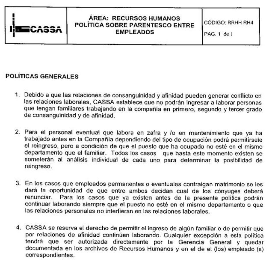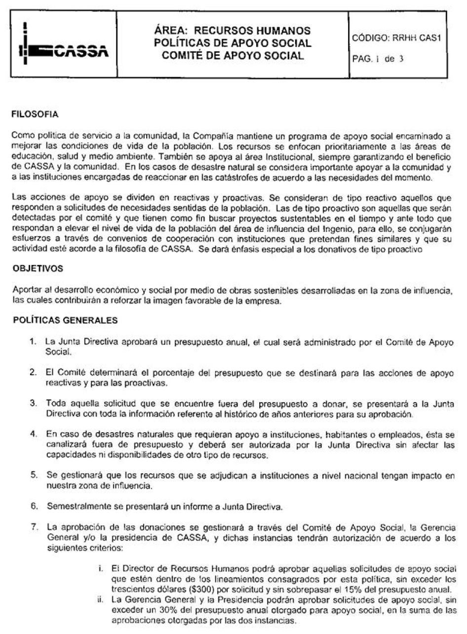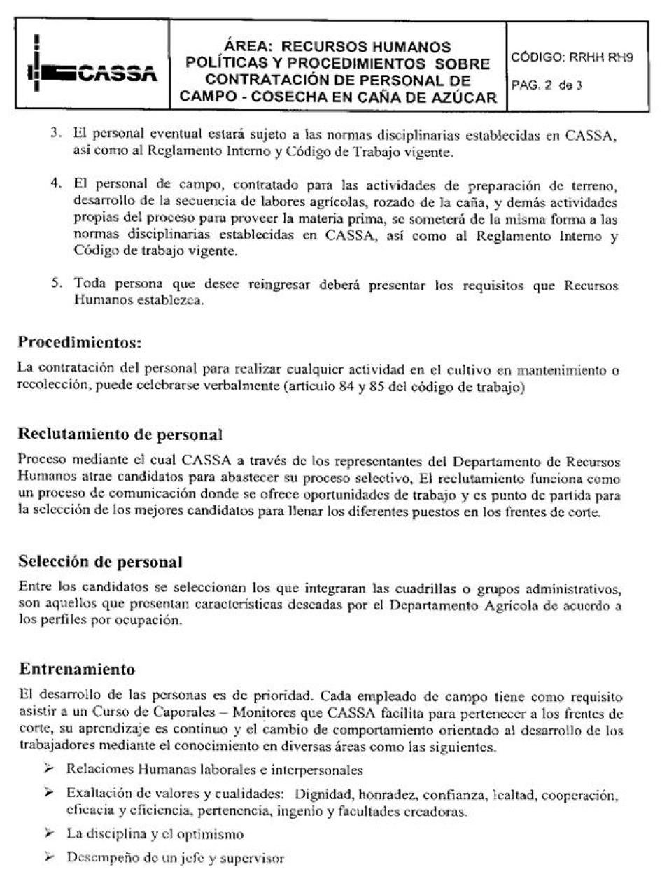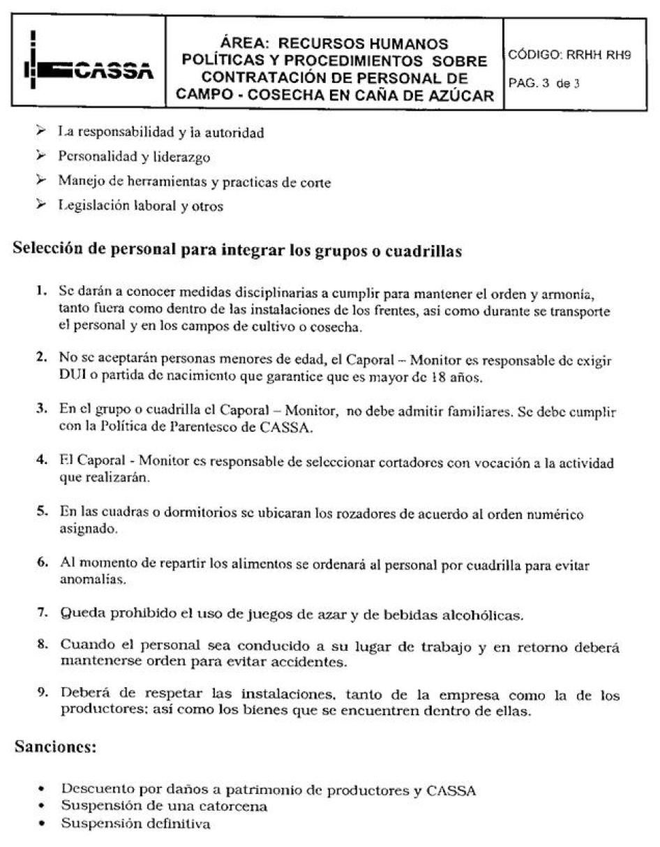 [253]Véase Compañía Azucarera Salvadoreña, S.A. de C.V., Área: Recursos humanos: Políticas y procedimientos sobre contratación de personal de campo—cosecha en caña de azúcar, cód. RRHH RH9, sin fecha, p. 2.