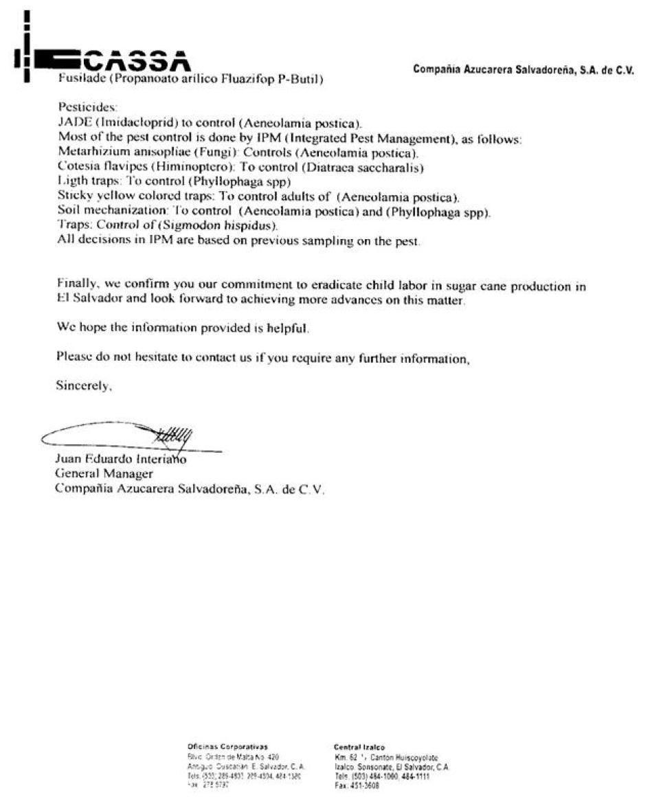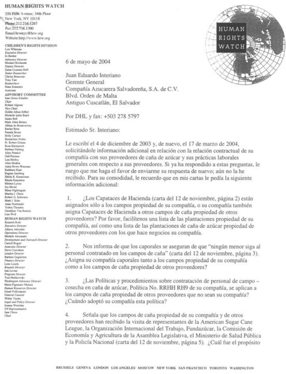 [242]Carta de Michael Bochenek, consejero, División de Derechos del Niño, Human Rights Watch, a Ingenio San Francisco, 21 de enero de 2004 (DHL Air Waybill No. 7845587805; recibida el 27 de enero de 2004, por Juan Reyes); carta de Michael Bochenek, consejero, División de Derechos del Niño, Human Rights Watch, a Ingenio La Cabaña, S.A. de C.V., 21 de enero de 2004 (DHL Air Waybill No. 7845587816; recibida a las 11:40 a.m., del 26 de enero de 2004, por Doris); carta de Michael Bochenek, consejero, División de Derechos del Niño, Human Rights Watch, a Compañía Azucarera Salvadoreña, S.A. de C.V., 14 de octubre de 2003 (artículo registrado No. RA 832981195US, sellado en Richmond, Vermont, 15 de octubre de 2003; recibo firmado y sellado en Nueva San Salvador, La Libertad, El Salvador, 27 de octubre de 2003); carta de Juan Eduardo Interiano, gerente general, Compañía Azucarera Salvadoreña, S.A. de C.V., a Michael Bochenek, consejero, División de Derechos del Niño, Human Rights Watch, 12 de noviembre de 2003; carta de Michael Bochenek, consejero, División de Derechos del Niño, Human Rights Watch, a Juan Eduardo Interiano, gerente general, Compañía Azucarera Salvadoreña, S.A. de C.V., 4 de diciembre de 2003 (artículo registrado no. RA 111950168US, sellado en Crown Point, New York, 8 de diciembre de 2003; no se ha recibido una justificante de recepción); carta de Michael Bochenek, consejero, División de Derechos del Niño, Human Rights Watch, a Juan Eduardo Interiano, gerente general, Compañía Azucarera Salvadoreña, S.A. de C.V., 17 de marzo de 2004 (DHL Air Waybill No. 7845587293; recibida el 22 de marzo de 2004, 3:39 p.m., por María); carta de Michael Bochenek, consejero, División de Derechos del Niño, Human Rights Watch, a Juan Eduardo Interiano, gerente general, Compañía Azucarera Salvadoreña, S.A. de C.V., 14 de octubre de 2003 (DHL Air Waybill No. 7845586976; recibida a las 3:49 p.m. del 10 de mayo de 2004, por María); carta de Juan Eduardo Interiano, gerente general, Compañía Azucarera Salvadoreña, S.A. de C.V., a Michael Bochenek, consejero, División de Derechos del Niño, Human Rights Watch, con fecha del 30 de abril de 2004 y enviada por fax a Human Rights Watch el 20 de mayo de 2004.