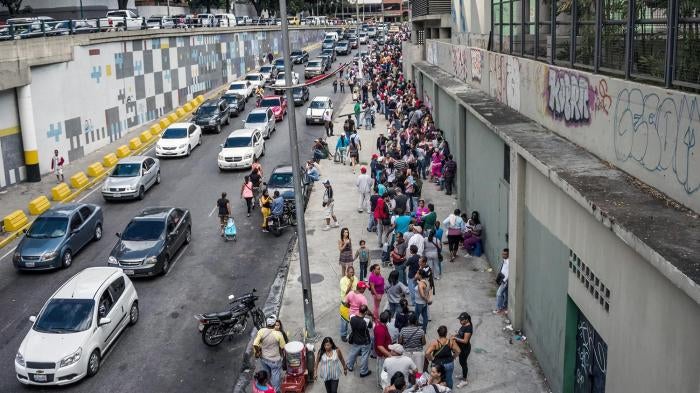 Muchísimas personas hacen fila para comprar artículos con escasez, como azúcar, aceite para cocinar, leche, arroz, papel higiénico y pañales para bebés, sujetos a control de precios, durante un evento gubernamental en Caracas, 24 de enero de 2015.
