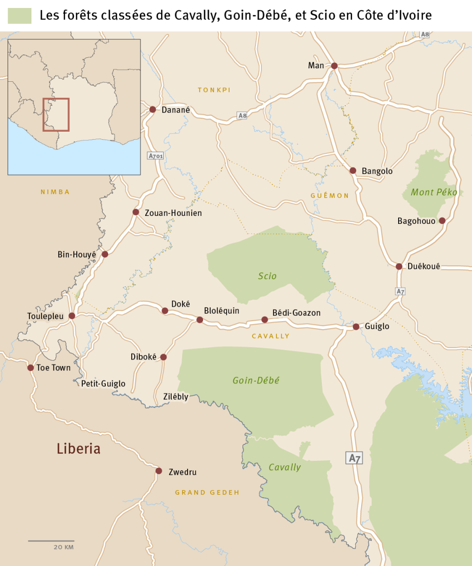 « Étant donné la vaste étendue de ces forêts, l’ampleur de la destruction est extrême », a déclaré à Human Rights Watch et au RAIDH Jean-Baptiste Kouamé, directeur de l’Unité de Gestion Forestière de la SODEFOR pour Cavally. « À Scio (88 000 hectares), il ne reste plus rien de la forêt, il n’y a que du cacao, ou un peu de café et de caoutchouc. À Goin-Débé (133 170 hectares), c’est la même chose. Il reste peut-être encore 10 000 hectares de forêt. Cavally (64 200 hectares) était mieux protégé, mais récemment il y a eu là une large infiltration. »