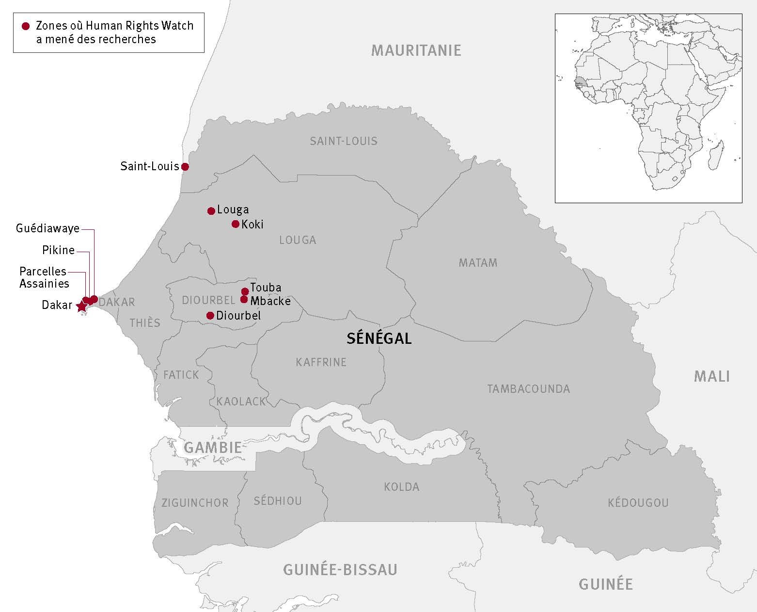 Ce rapport s’appuie sur des recherches menées en 2018 et 2019, dont une mission de recherche de deux semaines dans les régions administratives sénégalaises de Dakar, Saint-Louis et Diourbel en juin 2018 ; deux mois de recherches dans les régions de Dakar, Diourbel, Louga et Saint-Louis en décembre 2018 et janvier 2019 ; et des entretiens téléphoniques et une correspondance électronique avec des sources dans les régions de Dakar, Saint-Louis, Diourbel, Louga, Thiès, Tambacounda et Kaolack de mai 2018 à mai 2019. Parmi les villes dans lesquelles s’est rendu Human Rights Watch figurent Dakar, Saint-Louis, Diourbel, Touba, Mbacke, Louga et Koki. Des membres de la Plateforme pour la promotion et la protection des droits humains (PPDH) au Sénégal ont aidé à organiser les visites de daaras, et ont facilité les entretiens avec des maîtres coraniques et des autorités locales dans les régions de Diourbel, Louga et Saint-Louis.