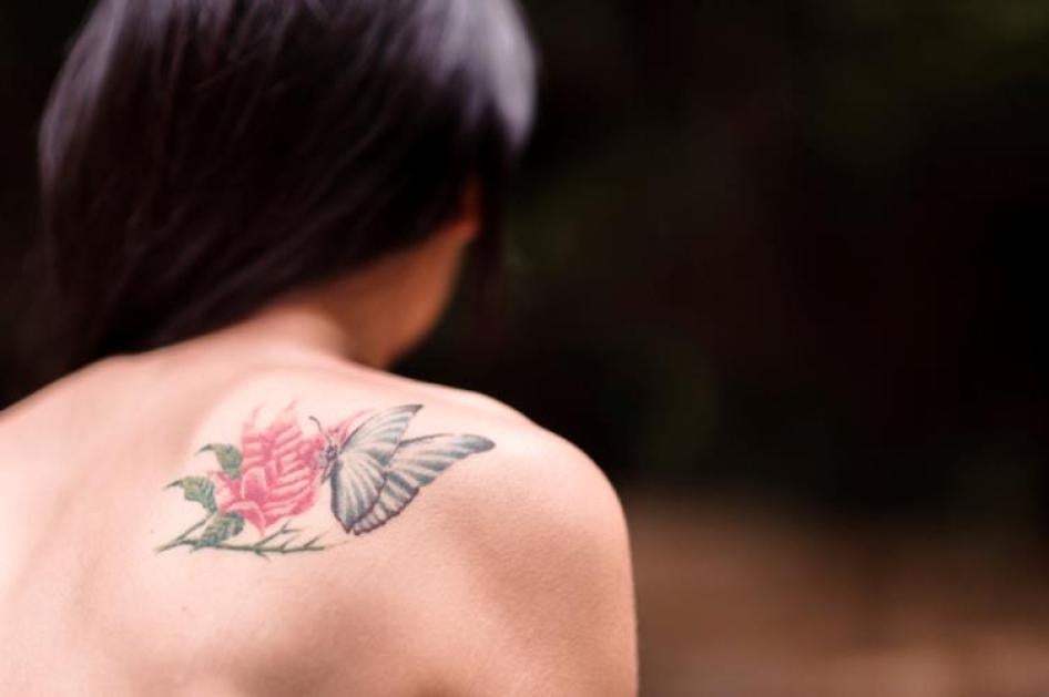 “Jina,” a 22-year-old transgender woman, sports a tattoo of a butterfly—a transgender symbol signifying transformation: “There’s a lot of politicization of the LGBT community at the moment, to distract the public from more important issues.” © 2014 Javad Tizmaghz for Human Rights Watch