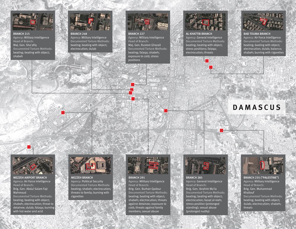 Locations of detention centers that were identified by multiple witnesses. Using satellite imagery, Human Rights Watch asked the victims and defectors to point out the buildings where torture took place. Former detainees and defectors corroborated the findings.