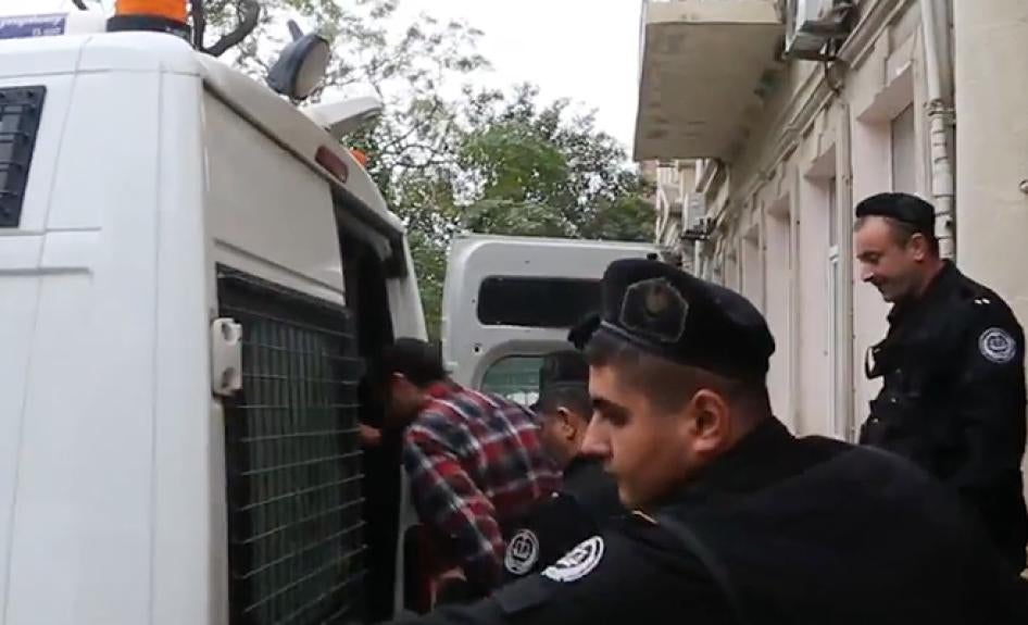Rasul Jafarov, a leading Azerbaijani human rights defender and government critic, is escorted by police officers into a van in Baku, Azerbaijan. © 2014 Obyetiv TV