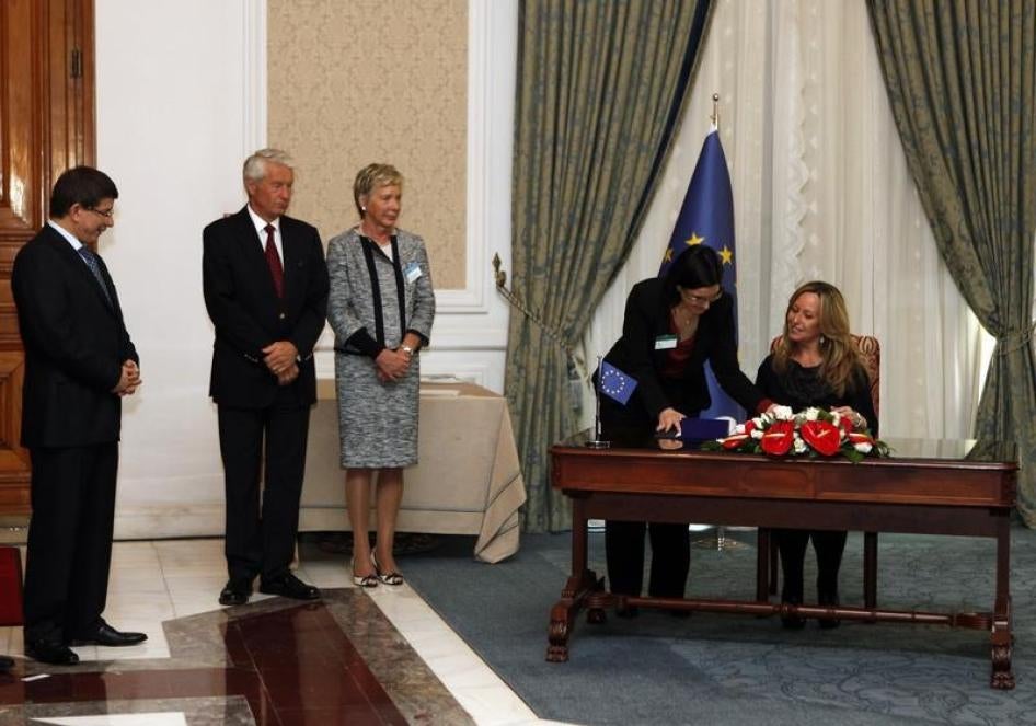 Spanish Foreign Minister Trinidad Jimenez (right) and Turkey's Foreign Minister Ahmet Davutoglu (left) attend a signing ceremony for a convention on preventing violence against women and combating domestic violence in Istanbul on May 11, 2011. © 2011 Reuters