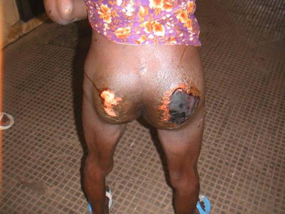 A prisoner in the Maison Centrale shows the wounds he allegedly received from being repeatedly beaten and whipped on the buttocks during police interrogation in June 2006. © 2006 Human Rights Watch