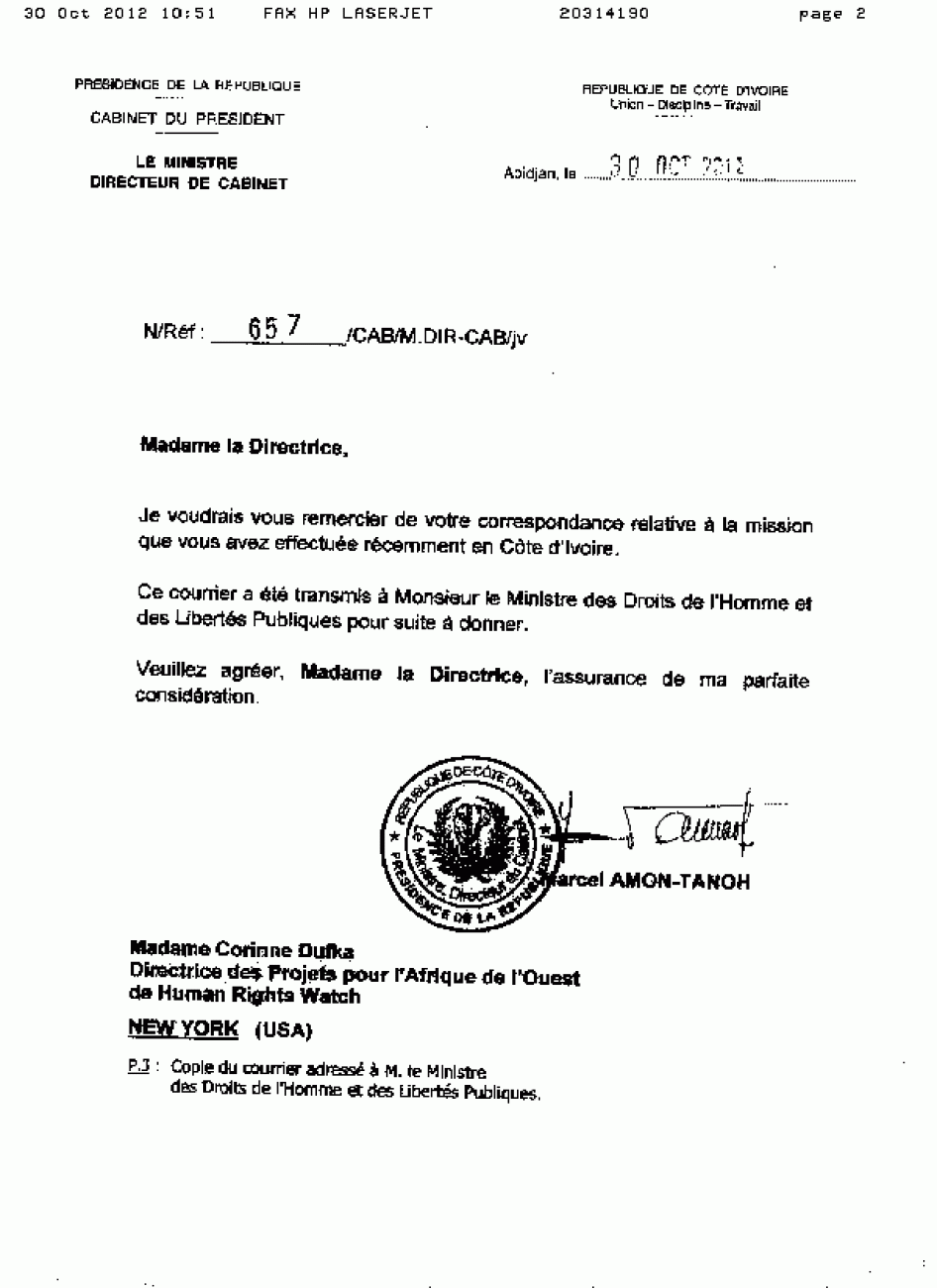 Human Rights Watch also wrote to Marcel Amon-Tanoh, chief of staff in the Ivorian presidency, on October 8, detailing the report’s main findings and asking for an official government response (see Annex I). Mr. Amon-Tanoh forwarded the request to the minister of human rights and public liberties (see Annex II), who responded to Human Rights Watch on November 1. Human Rights Watch has incorporated the government’s answers into the report body and has also included the entire response in Annex III.