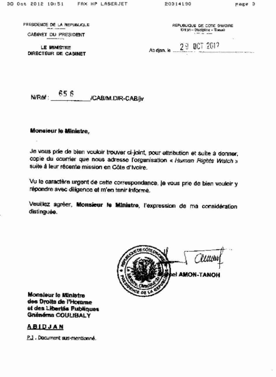 [108] Letter from Gnénéma Coulibaly, minister of human rights and public liberties, to Human Rights Watch, November 1, 2012.