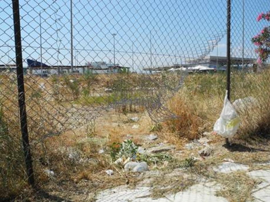 A hole in the fence surrounding the port at Patras, Greece; migrants use holes like these to enter the port and stow away on ships © 2012 Human Rights Watch