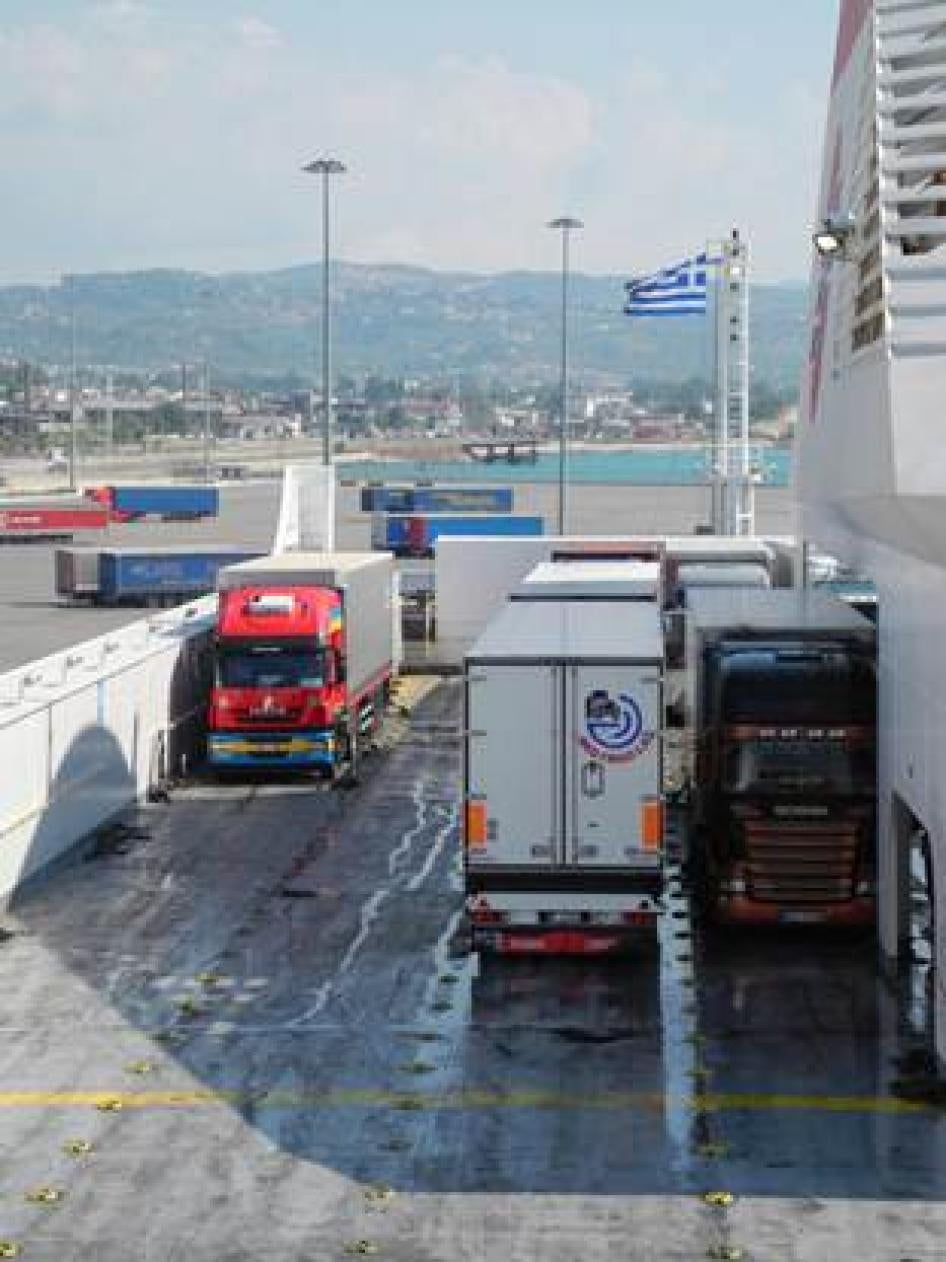 Trucks of the sort migrants stow away on hoping to reach Italy, loading onto ships at the Patras port. Migrants stow away between the axles, inside fuel tanks, or inside refrigerated containers. © 2012 Human Rights Watch