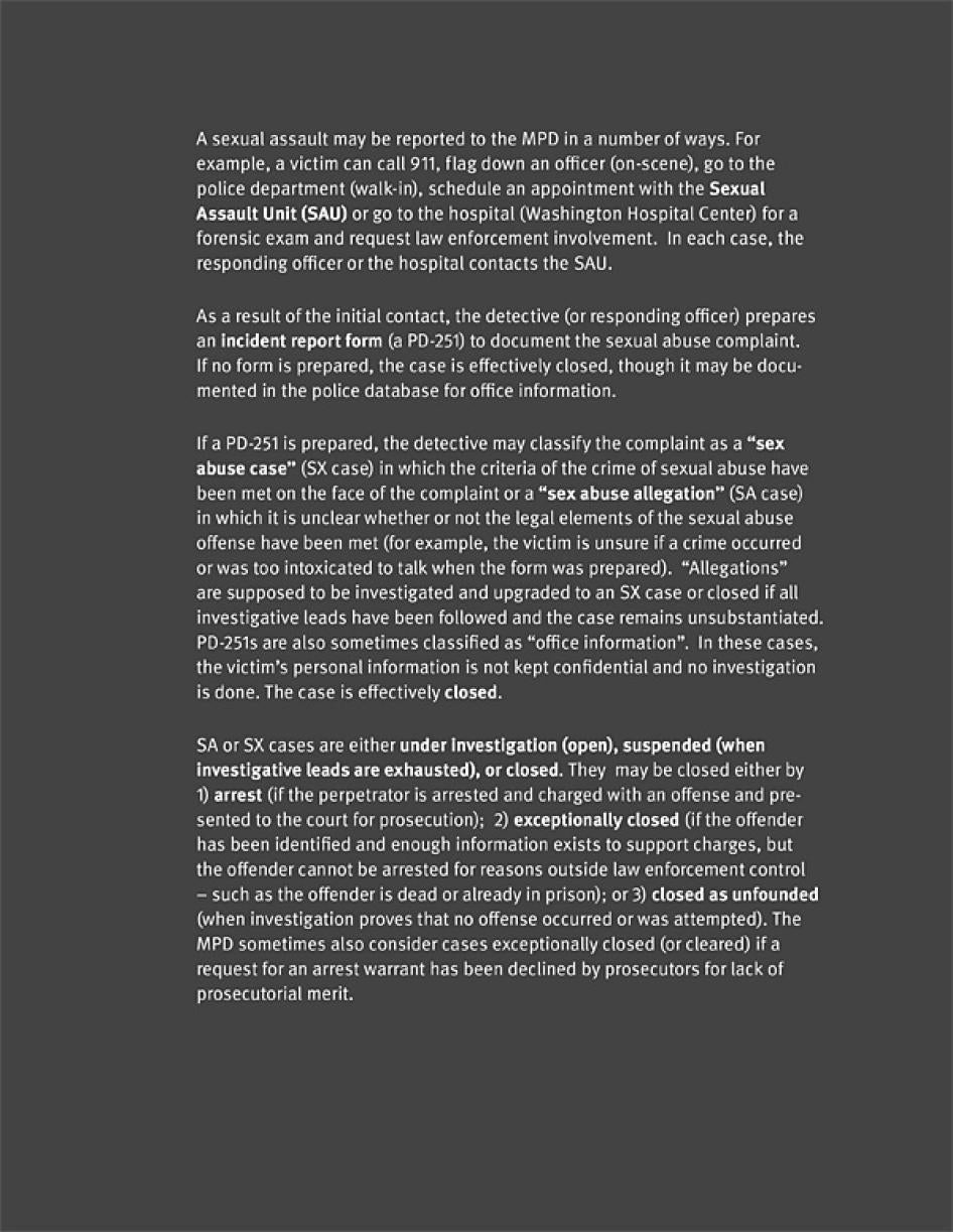 Office Information: Under MPD guidelines, a complaint of sexual abuse can be deemed an office information after preliminary investigation by a member of the Sexual Assault Unit, when it involves any of the following: “an arrest of a sex offender in another jurisdiction; a report of an offense that occurred in another jurisdiction (information that can possibly be used in the future); sexual activity that is not a crime; and no crime was deemed to have occurred.” Once a complaint is classified as “office information,” no further investigation is conducted or required. Police sometimes further classify these cases as “miscellaneous” or “sick [or injured] person to hospital,” but they still fall under the general broad category of cases that are not investigated but documented only for “office information” purposes.