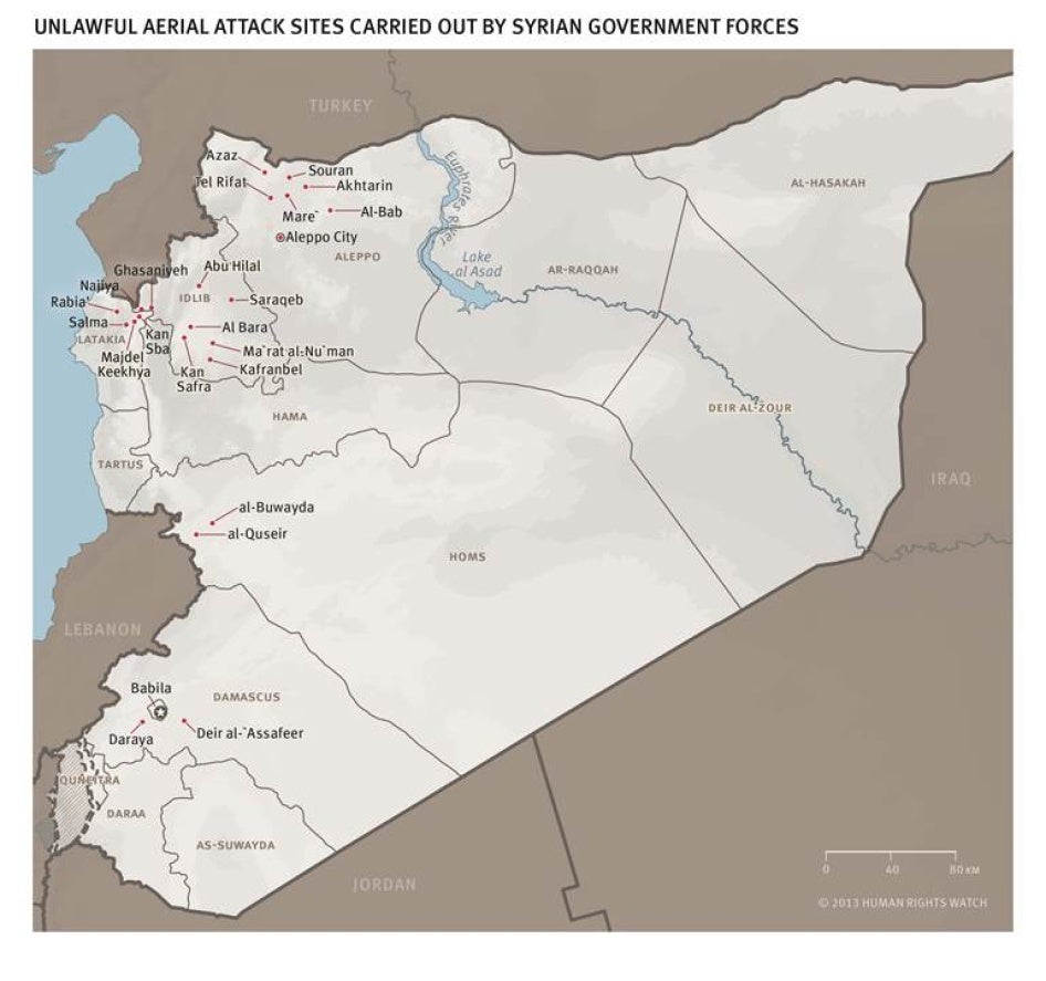 In this report, Human Rights Watch documents 59 unlawful attacks, the sites of which we were able to visit. These attacks include deliberate attacks against civilians and indiscriminate attacks—that is air strikes that did not or could not distinguish between civilians and combatants. Both types of attacks are serious violations of international humanitarian law (the laws of war).Human Rights Watch has found that the Syrian Air Force appears to have carried out indiscriminate air strikes with knowledge of their indiscriminate effect.
