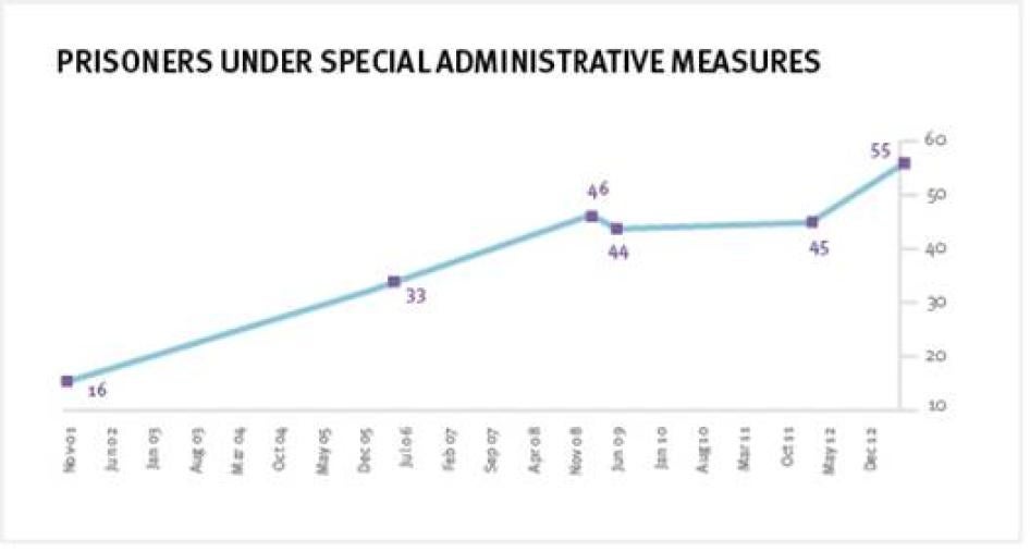 [692] See Human Rights Watch Letter to Harley G. Lappin, Federal Bureau of Prisons , May 2, 2007, http://www.hrw.org/news/2007/05/01/letter-harley-g-lapin-federal-bureau-prisons-re-adx-florence; Memorandum from Michael B. Cooksey, Assistant Director Correctional Programs Division, Federal Bureau of Prisons to all Chief Executive Officers, “Guidance for Handling of Terrorists and Recent Detainees,” October 1, 2001(“Following the tragic events of September 11, 2001, all inmates in the custody of the Bureau of Prisons who were convicted of, charged with, associated with, or in any way linked to terrorist activities were placed in Administrative Detention as part of an immediate national security endeavor.” (quoted and discussed in Laura Rovner and Jeanne Theoharis, “Preferring Order to Justice,” American University Law Review, Vol. 61 (2012), http://www.aulawreview.org/pdfs/61/61-5/Rovner-Theoharis.website.pdf (accessed June 26, 2014), p. 1331.)).