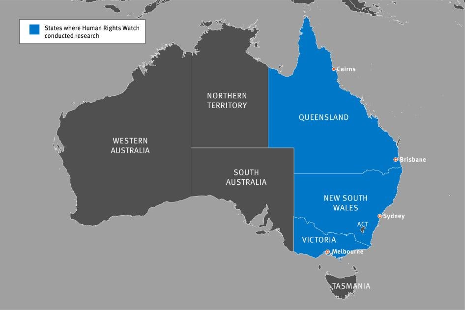 This report is based on Human Rights Watch interviews with 89 people conducted between April 2018 and August 2019 in the Australian Capital Territory; in and around the cities of Brisbane and Cairns in Queensland; in and around Melbourne, Victoria; and in and around Sydney in New South Wales. The three states were selected based on their high populations of older people and number of aged care facilities. Human Rights Watch conducted additional phone interviews from January 2019 through August 2019.